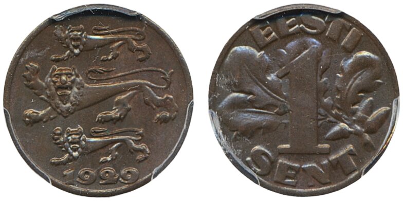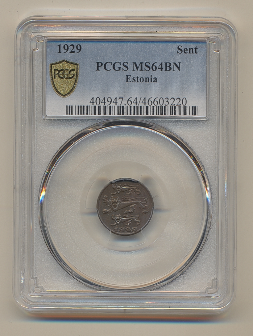 Coins, Estonia. KM 10, 1 sent 1929. Graded by PCGS as MS64 BN. XF-UNC. See certification at PCGS