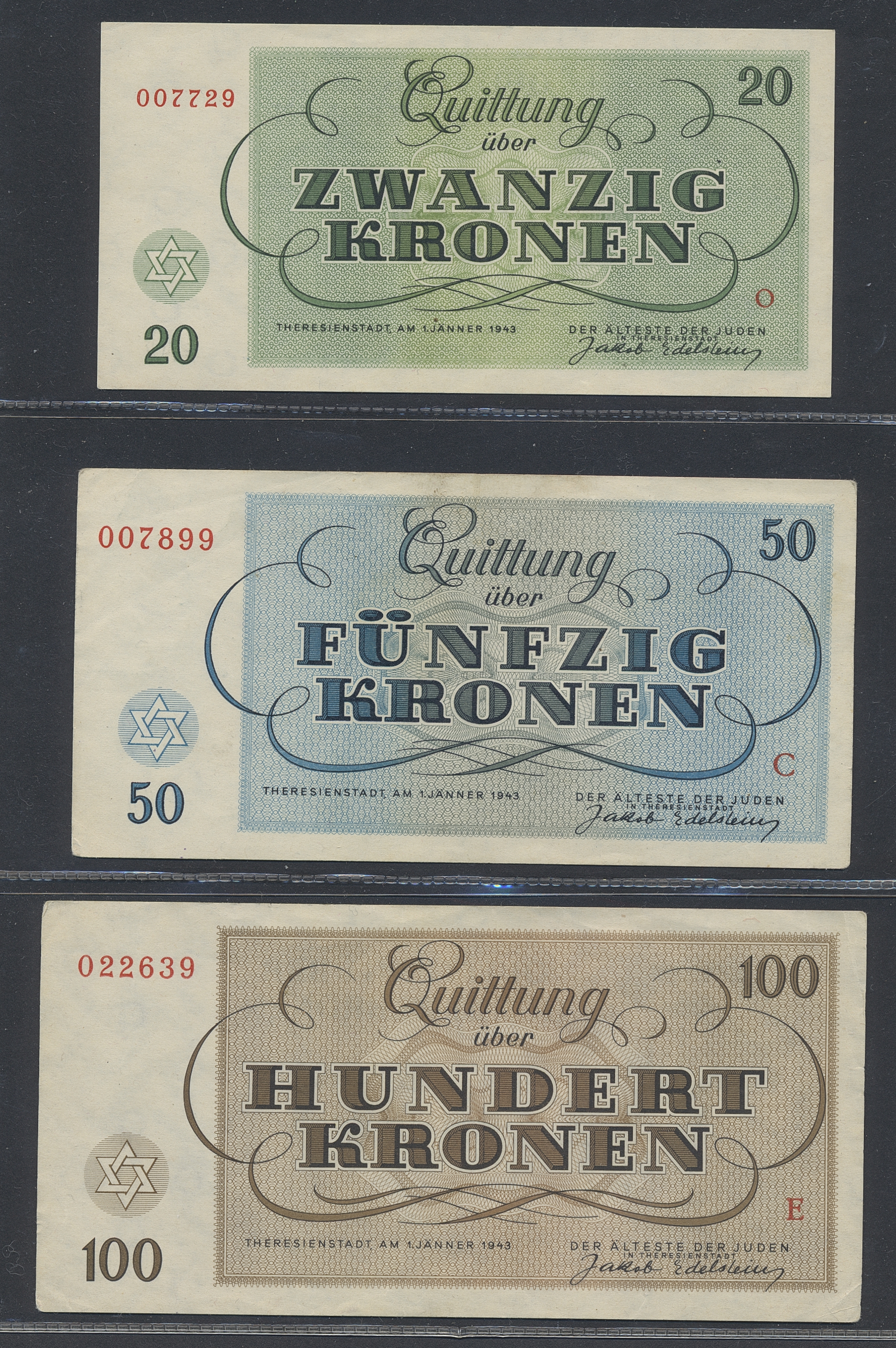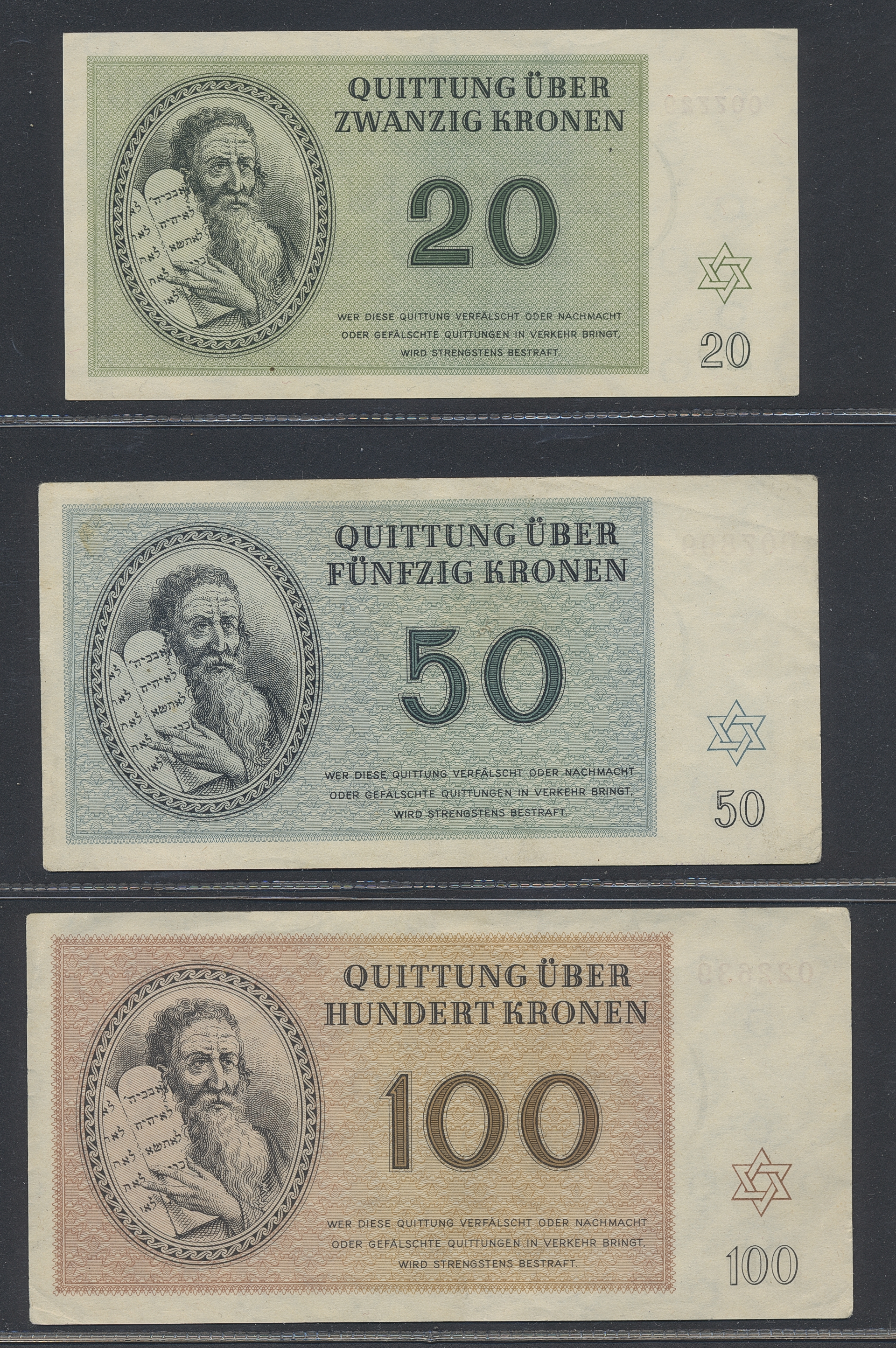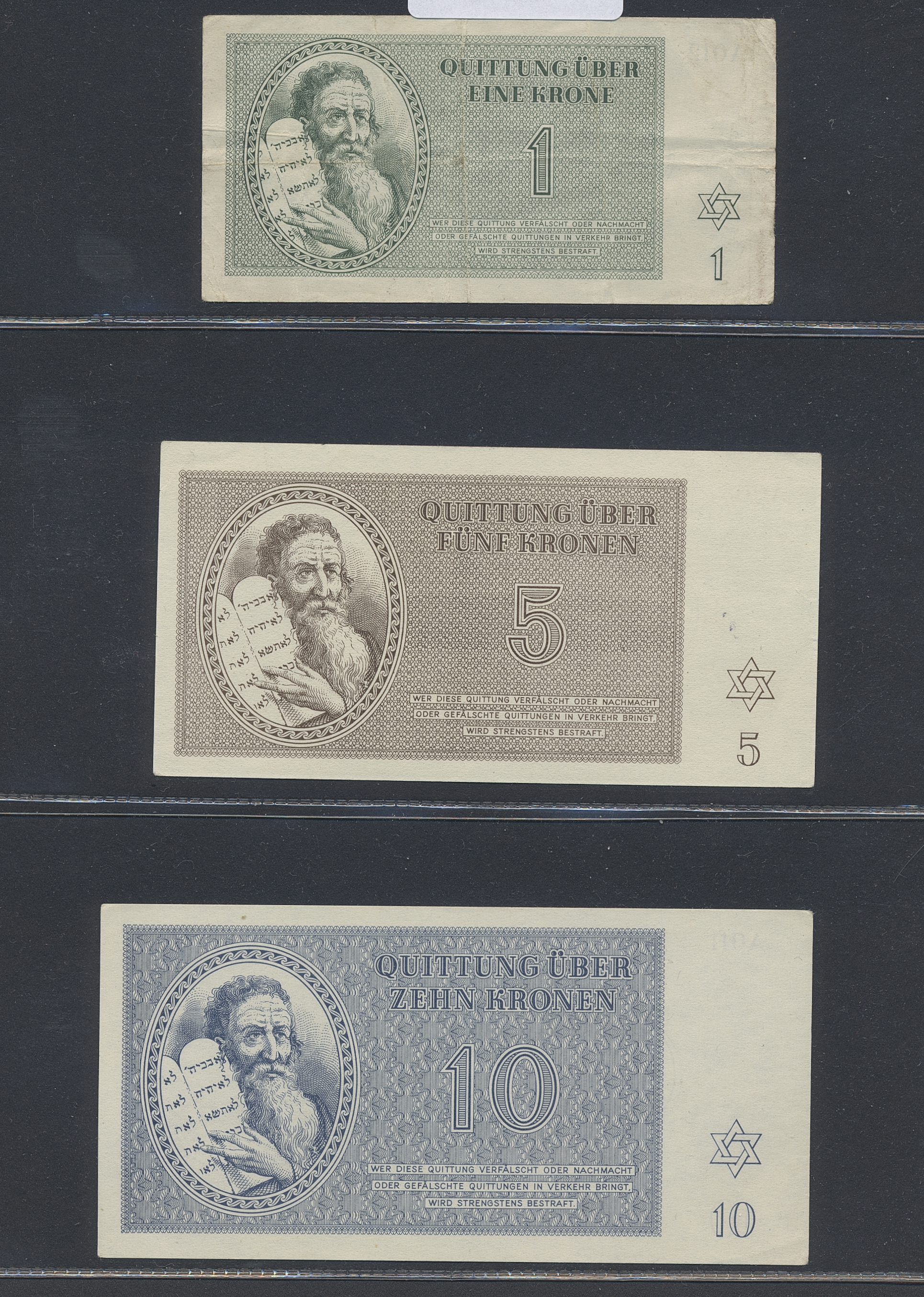 Banknotes, Germany. Six banknotes from Theresienstadt, 1–100 Kronen, mixed quality.