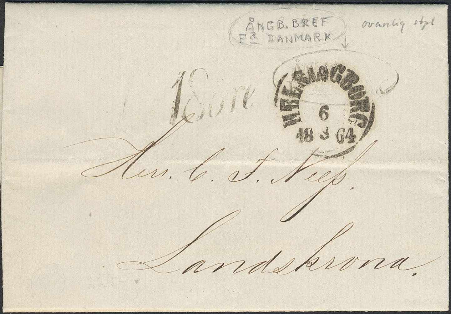 Sweden. Foreign-related cover. Denmark. Unpaid cover sent from 'Köpenhamn 5 mars' via HELSINGBORG 6.3.1864 with cancel ÅMGB. BREF FR. DANMARK (P: 6000) and postage due mark 18 öre.