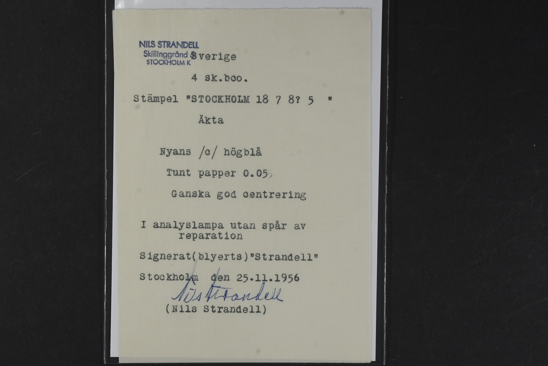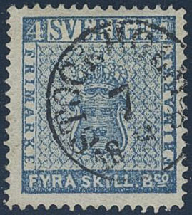 Sweden. Facit 2c used, 4 skill bright blue, thin paper. Cancelled STOCKHOLM 7.8.185x. Signed and certificate by Strandell (1956). SEK 1900