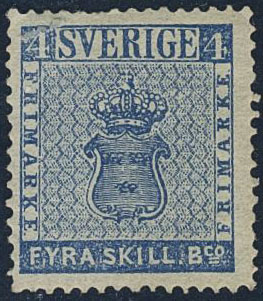 Sweden. Facit 2n1 (★), 4 skill dark blue, medium-thick paper. Some perf. imperfections. Thin layer of gum. Opinion (shade) by O.P. Very scarce shade in unused condition. F 20000.