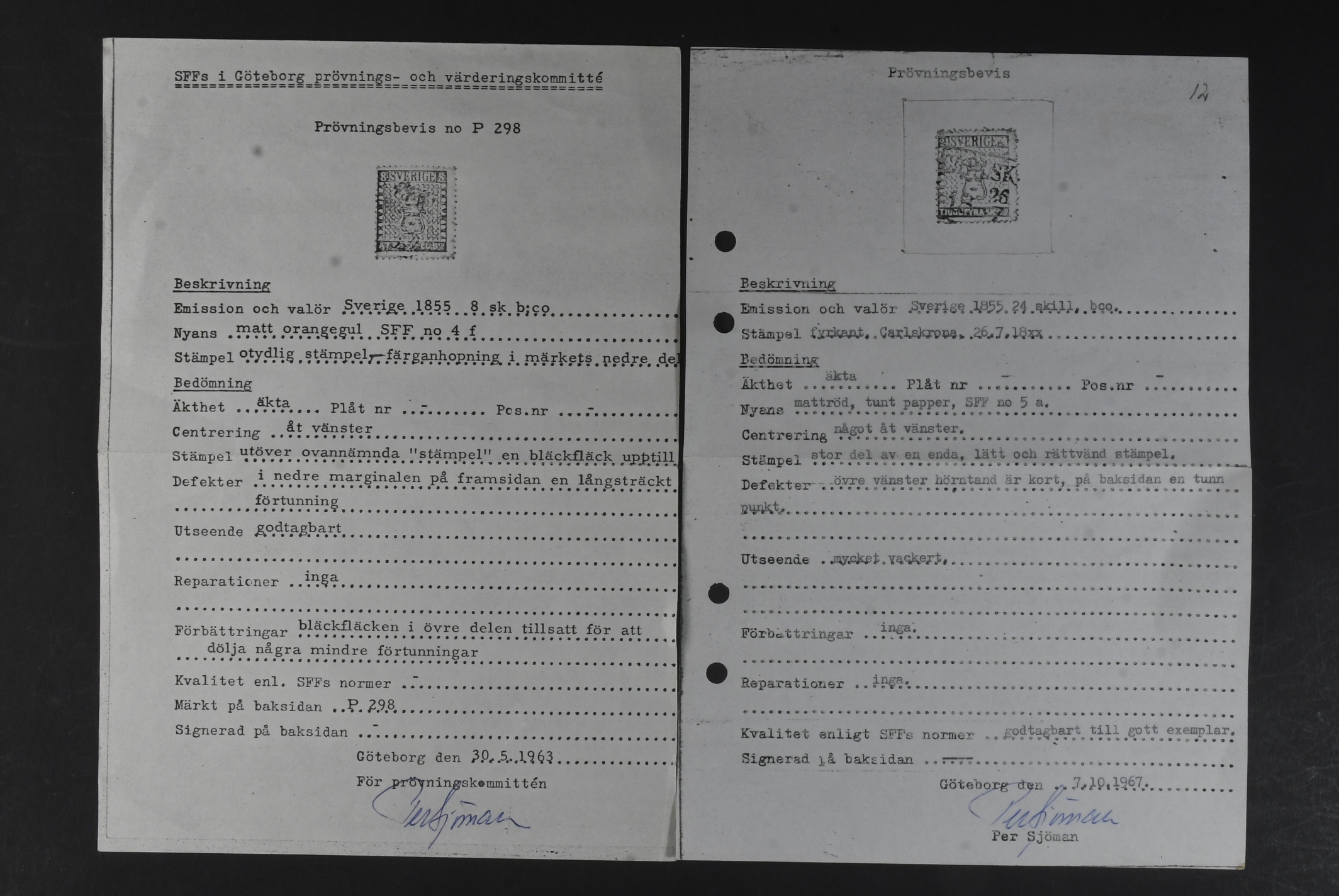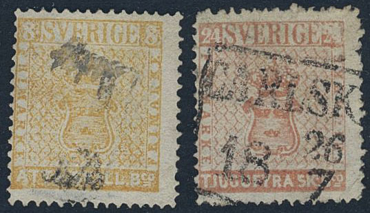 Sweden. Facit 4f, 5a used, 8 skill dull yellow-orange, dense background on medium thick paper and 24 skill dull red, thin paper. Mixed quality. Both with cert. P. Sjöman.