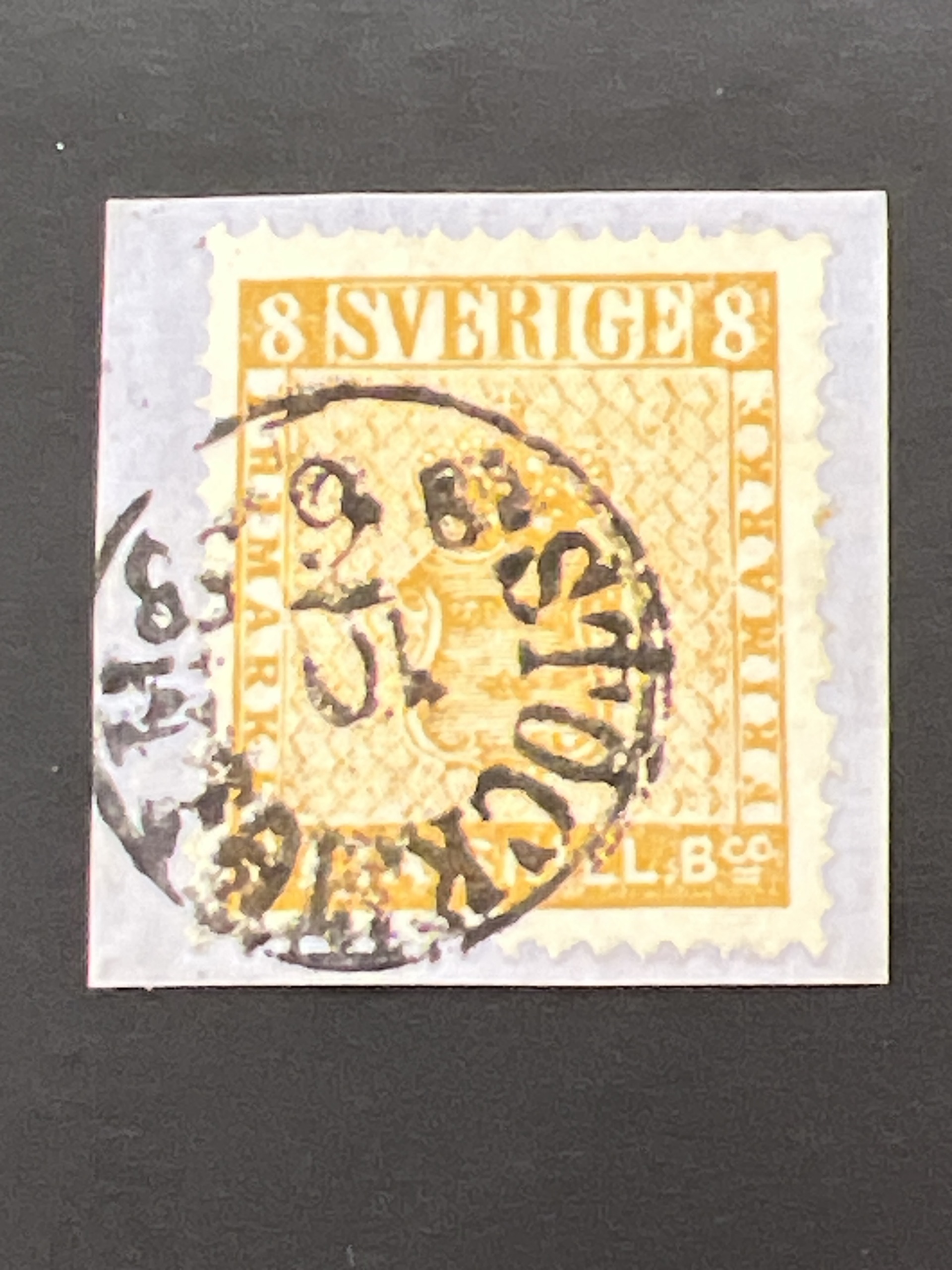 Sweden. Facit 4h used, 8 skill orange-yellow, clear print on medium thick paper (2 copies known) on cut piece with cancellation STOCKHOLM 10.6.1858. Certificate HOW 3, 4, 3. SEK 5500