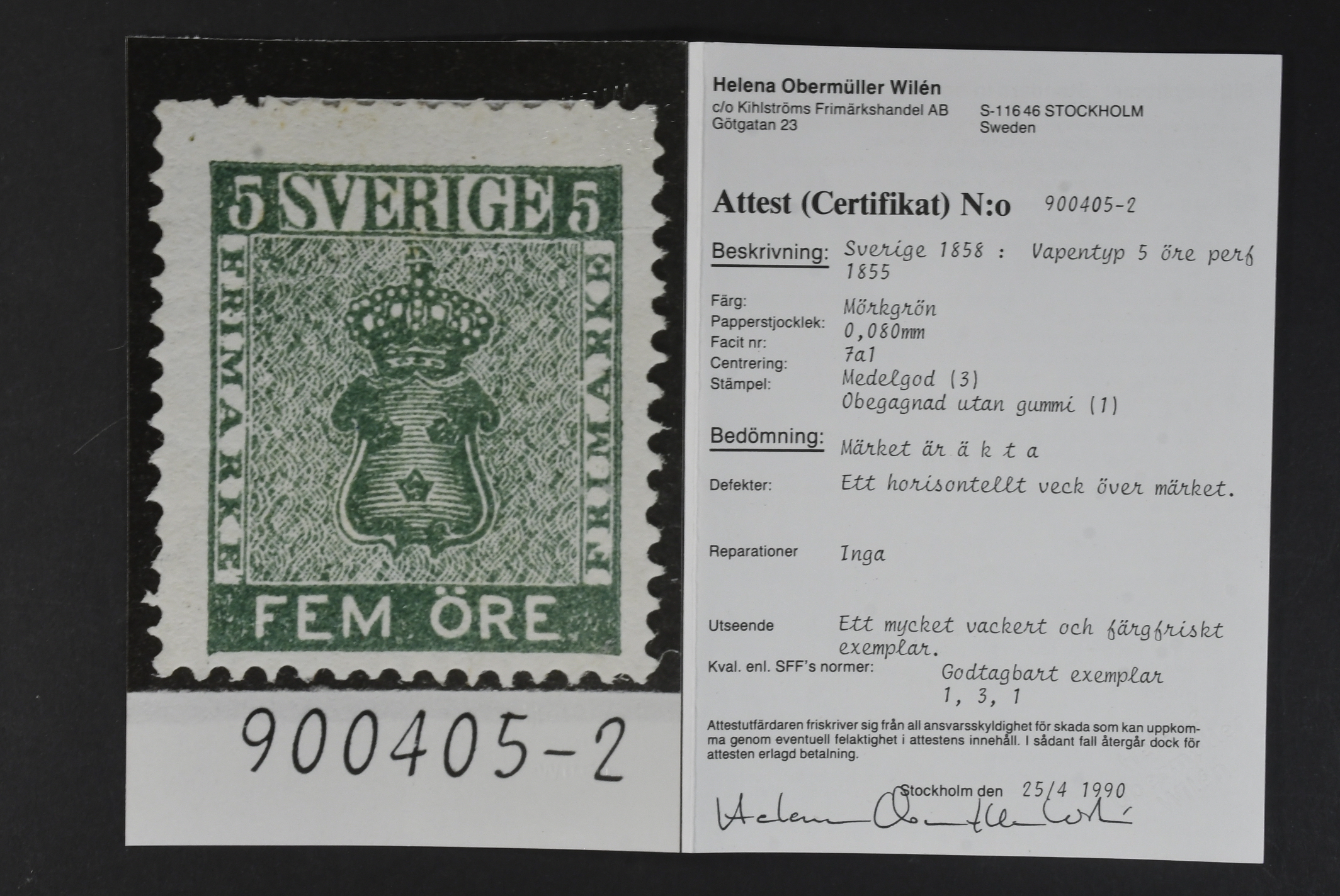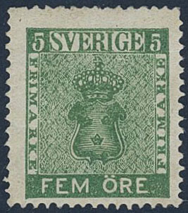 Sweden. Facit 7a1 (★), 5 öre dark green. Horizontal crease otherwise very beautiful and colourful. Scarce shade. Certificate HOW (1990).