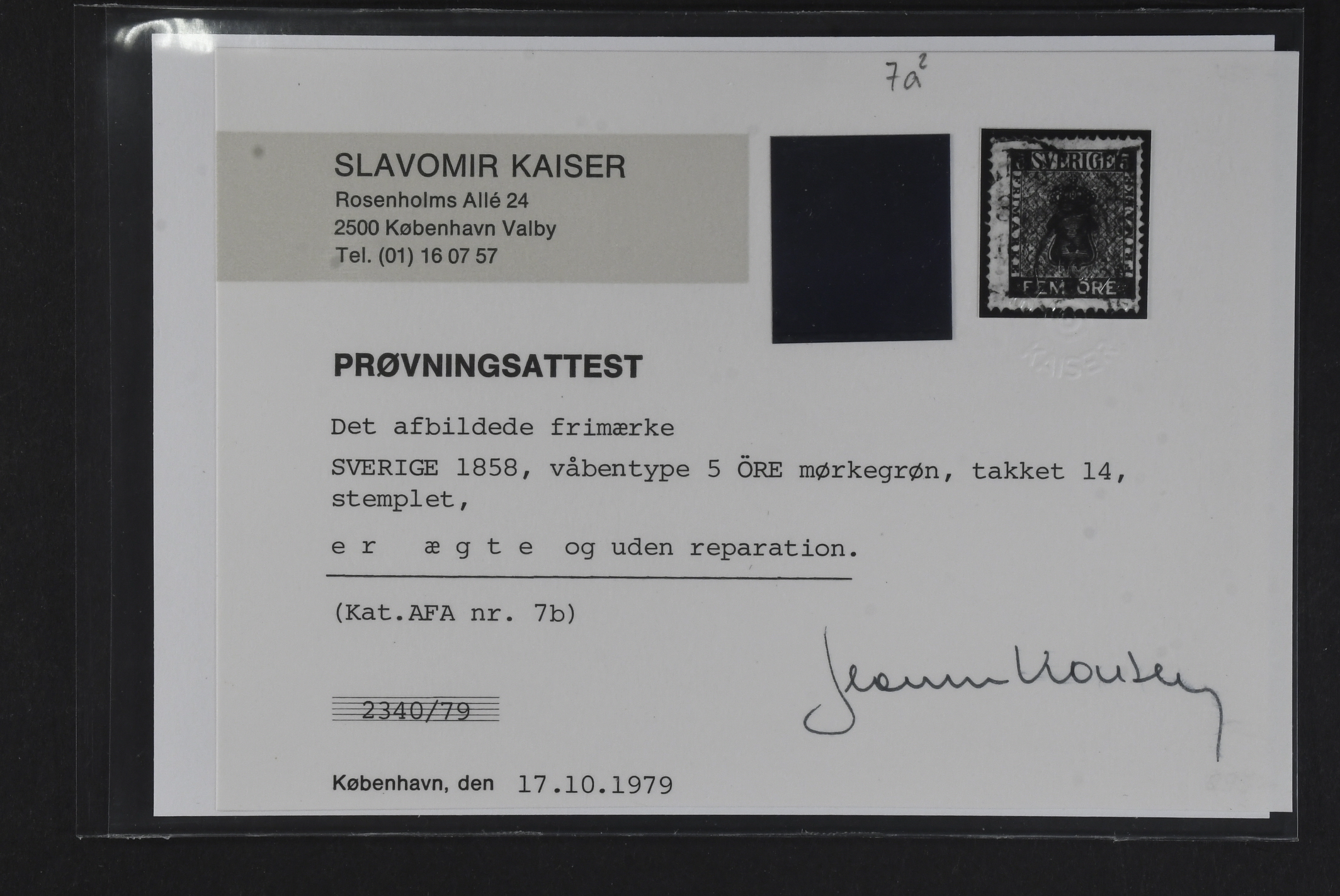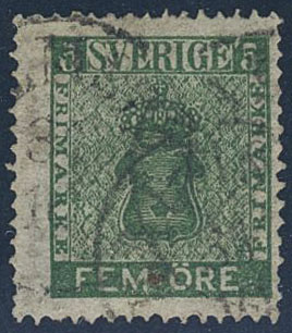 Sweden. Facit 7a2 used, 5 öre dark green, dense background. Certificate Kaiser (1979). SEK 3500