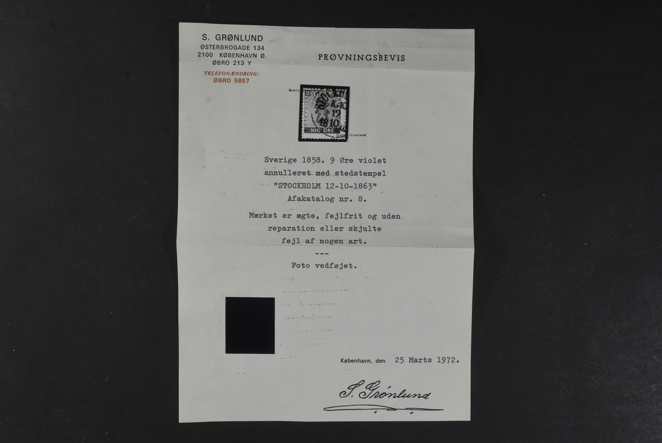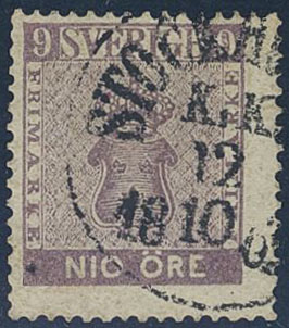 Sweden. Facit 8 used, 9 öre violet. Cancelled STOCKHOLM K:K: 12.10.1863. Small owner mark on the reverse. Certificate Grönlund (1972). SEK 2200