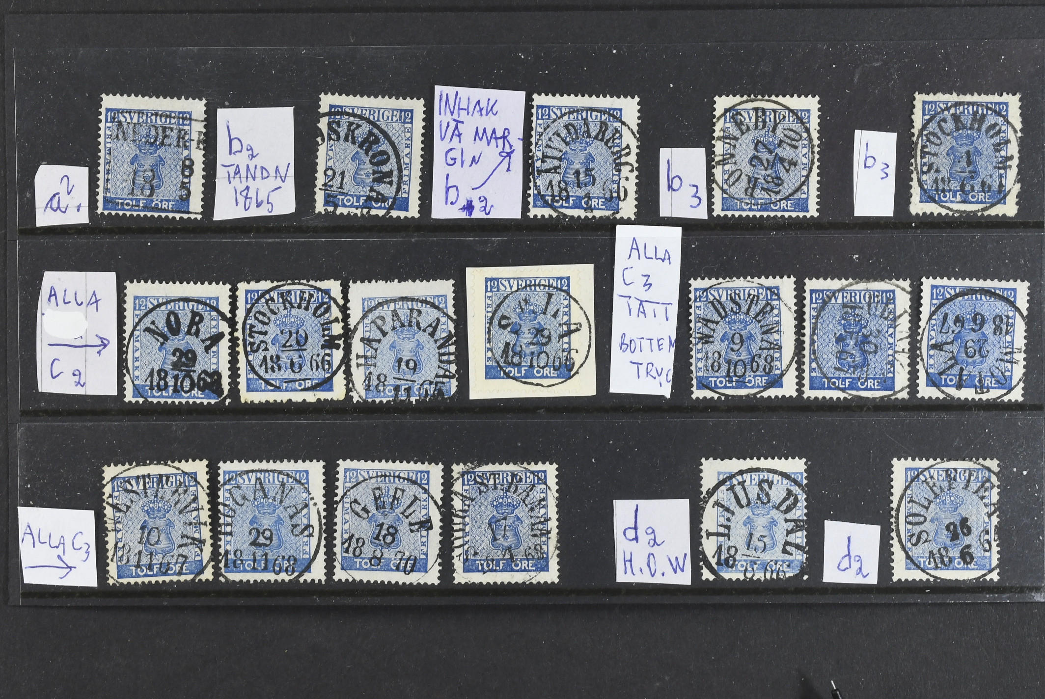 Sweden. Facit 9 used, 12 öre blue. 39 ex in several shades and several with nice cancels.