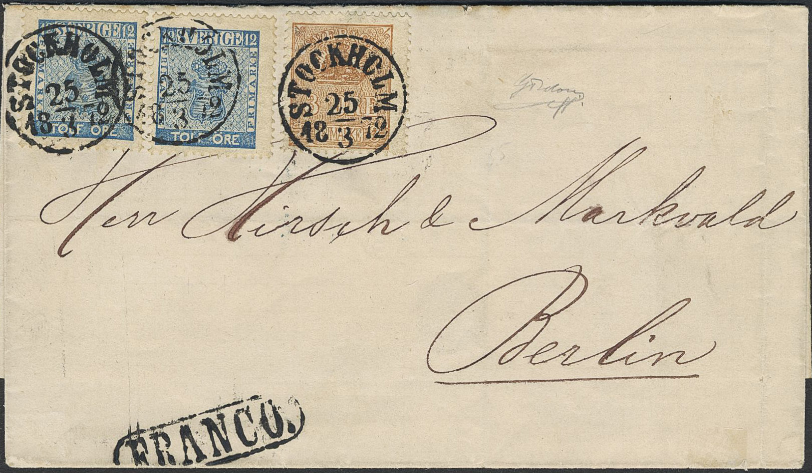 Sweden. Facit 9, 14B on cover, 3+2×12 öre on beautiful cover sent from STOCKHOLM 25.3.1872 to Germany, with arrival pmk AUSG. 29.3. Certificate N.S. 2–3.3.3–4 (1983).