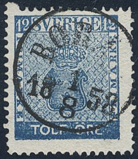 Sweden. Facit 9a1 used, 12 öre greenish dark blue with one double perf. Superb cancellation BORÅS 1.8.1858. Allegedly, position 98.