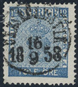 Sweden. Facit 9c1 used, 12 öre blue. Superb cancellation ÖRNSKÖLDSVIK 16.9.1858. Allegedly position 17. One weakly bent corner perf.