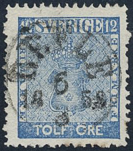 Sweden. Facit 9d1 used, 12 öre light blue. Superb cancellation GEFLE 6.3.1859. Allegedly, position 46. Small, light ink lines on reverse.