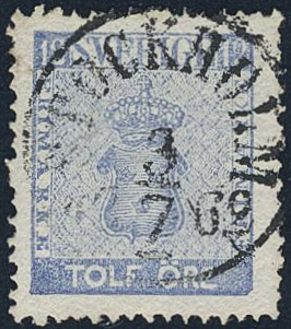 Sweden. Facit 9i used, 12 öre dull ultramarine with one double perf. EXCELLENT cancellation STOCKHOLM 3.7.1862. Allegedly, position 81 plate 3.