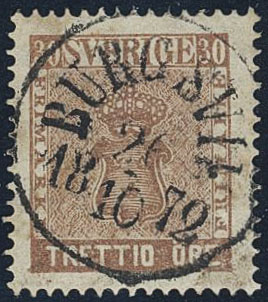 Sweden. Facit 11 used, 30 öre brown. Superb cancellation BURGSVIK 26.10.1872.