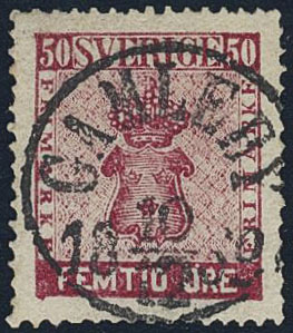 Sweden. Facit 12c used, 50 öre bright dark carmine. EXCELLENT cancellation GAMLEBY 10.12.1862. Small repair.