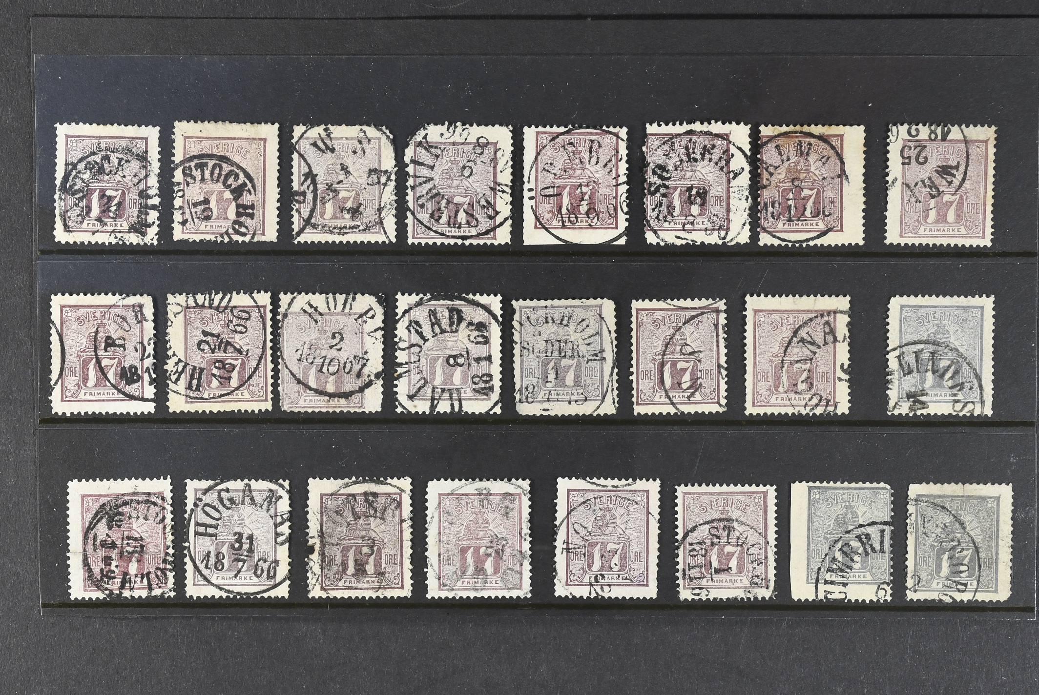 Sweden. Facit 15 used, 17 öre violet/grey. 24 ex. in very mixed quality/space filler.