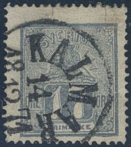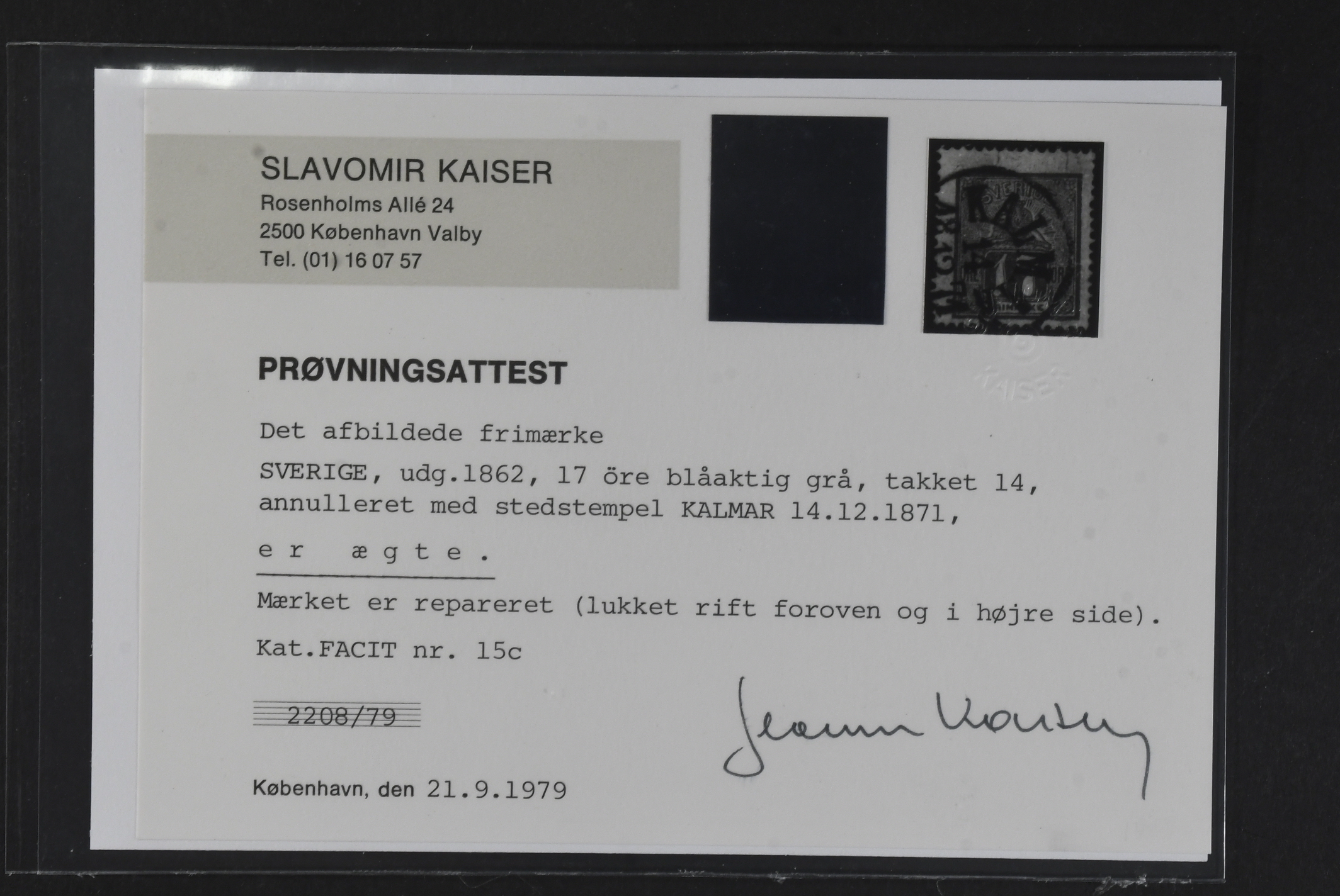 Sweden. Facit 15c used, 17 öre bluish grey. Cancelled KALMAR 14.12.1871. Repaired tear. Certificate Kaiser (1979). SEK 6500