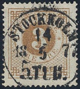 Sweden. Facit 17h used, 3 öre olivish orange-brown. Superb cancellation STOCKHOLM 5.TUR 14.5.1877.