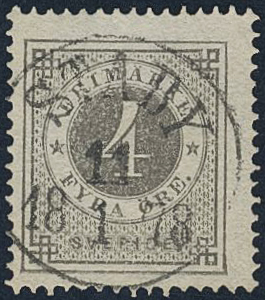 Sweden. Facit 18a used, 4 öre dark grey. EXCELLENT cancellation STABY 11.1.1878.