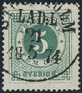 Sweden. Facit 19c used, 5 öre emerald green. Superb cancellation STOCKHOLM LAD:L 21.5.1874. Signed by O.P.