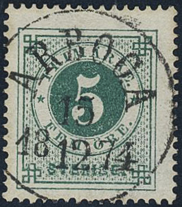 Sweden. Facit 19e used, 5 öre dark blue-green, smooth print. EXCELLENT cancellation ARBOGA 15.12.1874. One slightly short perf.