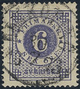 Sweden. Facit 20b used, 6 öre ultramarine-violet on yellowish paper. EXCELLENT cancellation LINKÖPING 30.7.1873. Signed by O.P.