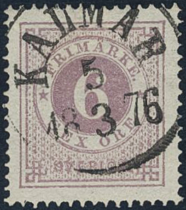 Sweden. Facit 20j used, 6 öre lilac. Superb cancellation KALMAR 5.3.1876.