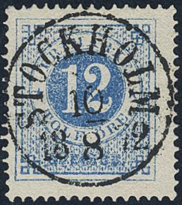 Sweden. Facit 21e used, 12 öre ultramarine-blue on ordinary paper. EXCELLENT cancellation STOCKHOLM 10.8.1872.