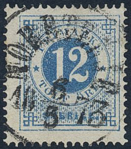 Sweden. Facit 21i used, 12 öre clear blue on ordinary paper. Superb cancellation NORRTELJE 6.5.1873.