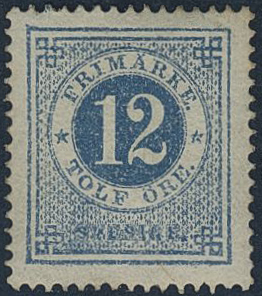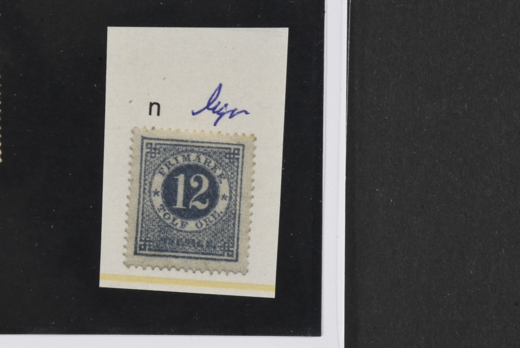 Sweden. Facit 21n ★, 12 öre dark blue, dense blurred background. Superb–EXCELLENT centering. Opinion (shade) by Mats Nilsson. SEK 2200