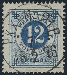 Sweden. Facit 21o used, 12 öre ultramarinish deep blue, distinct print. EXCELLENT cancellation PKXP Nr21B 7.2.1876. Somewhat rough perf. at bottom. Opinion (shade) by O.P.