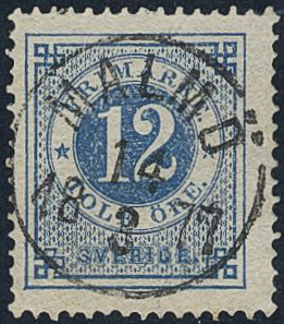 Sweden. Facit 21p used, 12 öre dull blue-light blue. EXCELLENT cancellation MALMÖ 14.3.1877.