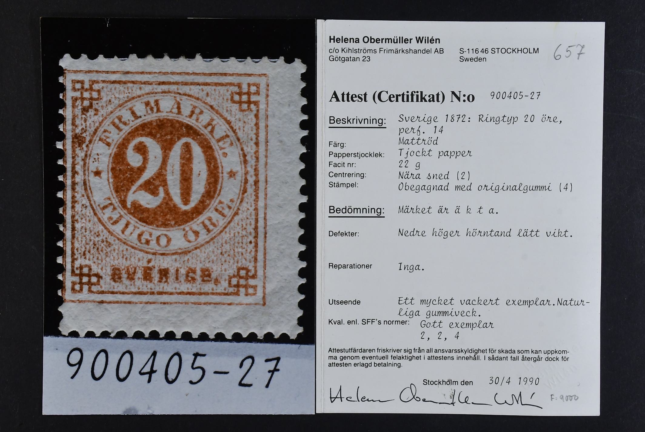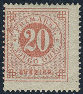 Sweden. Facit 22g ★, 20 öre dull red. Certificate HOW 2, 2, 4 (1990). SEK 11000