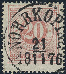 Sweden. Facit 22g used, 20 öre dull red. Superb cancellation NORRKÖPING 21.11.1876.