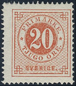 Sweden. Facit 22h ★, 20 öre brick red. SEK 12000