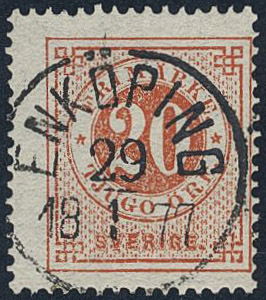 Sweden. Facit 22h used, 20 öre brick red. EXCELLENT cancellation ENKÖPING 29.1.1877.
