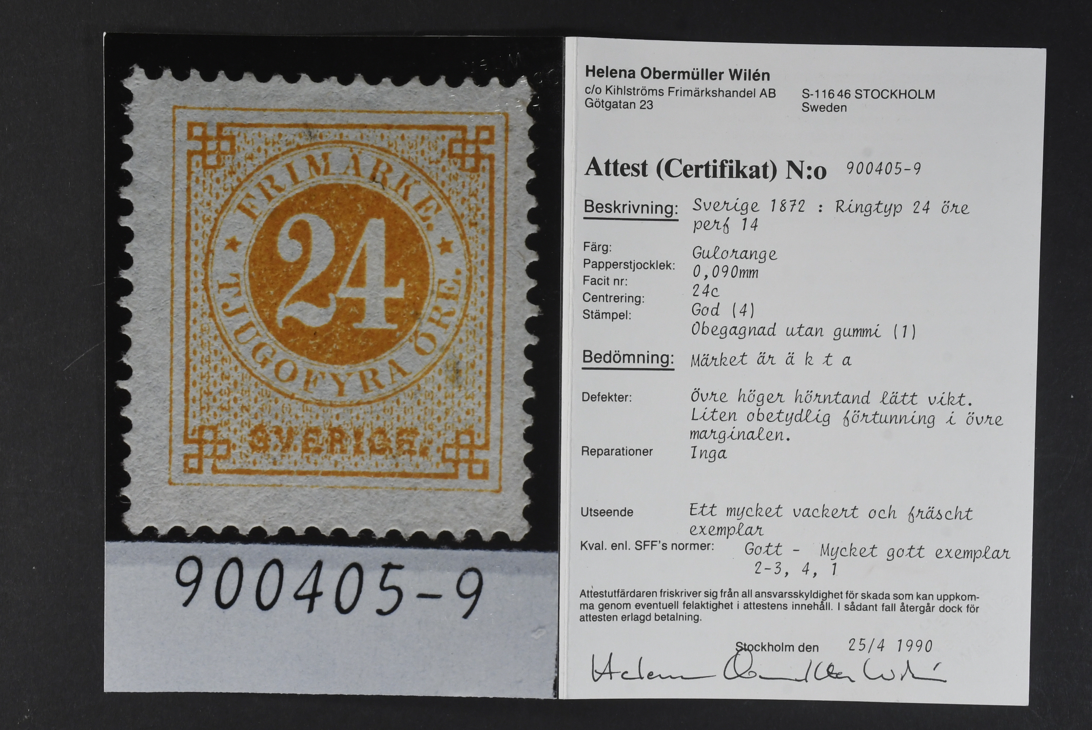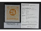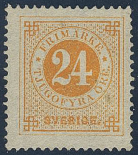 Sweden. Facit 24c (★), 24 öre yellow-orange on yellowish paper. One corner perf lightly folded, small insignificant thinning. Superb centering. Certificate HOW 2–3, 4, 1 (1990).