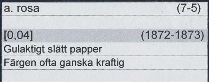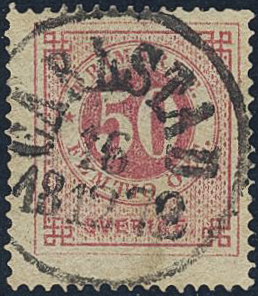 Sweden. Facit 26a used, 50 öre rose on yellowish paper. Superb cancellation CARLSTAD 16.12.1872. Two perfs cut and one bent corner perf. Scarce shade.