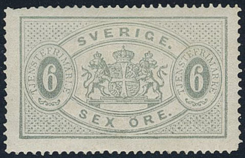 Sweden. Official Facit Tj4c ★, 6 öre olivish grey, perf 14. Short corner perf. SEK 4200