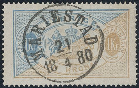 Sweden. Official Facit Tj10 used, 1 Kr blue/brown, perf 14 (min tear). Superb/Excellent MARIESTAD 21.4.80.