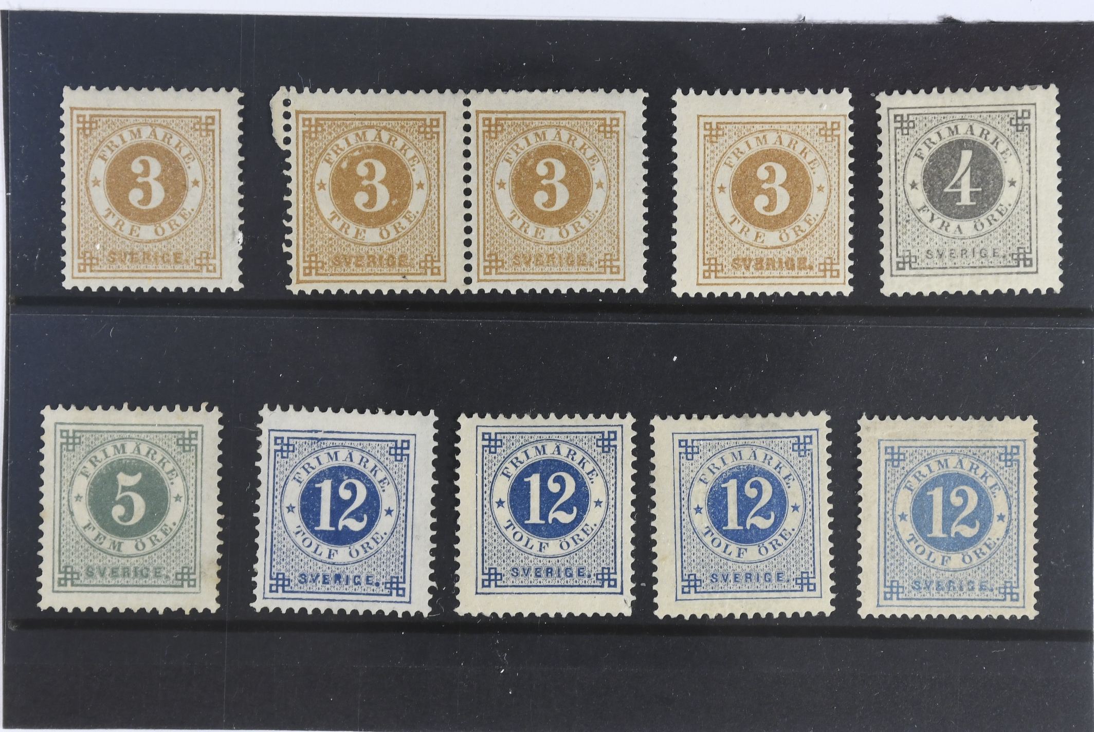 Sweden. Facit 28–30, 32 ★, Circle type perf. 13 without posthorn. Ten stamps.