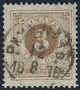Sweden. Facit 28c used, 3 öre dark orange-brown. Superb cancellation PKXP 12.8.1878. Scarce shade.
