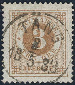 Sweden. Facit 28e used, 3 öre orange-brown, clean distinct print. Superb cancellation TÄN`G 8.5.1883.