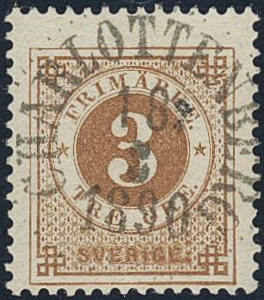Sweden. Facit 28g used, 3 öre deep orange-brown, calendered paper. EXCELLENT cancellation CHARLOTTENBERG 18.3.1890.