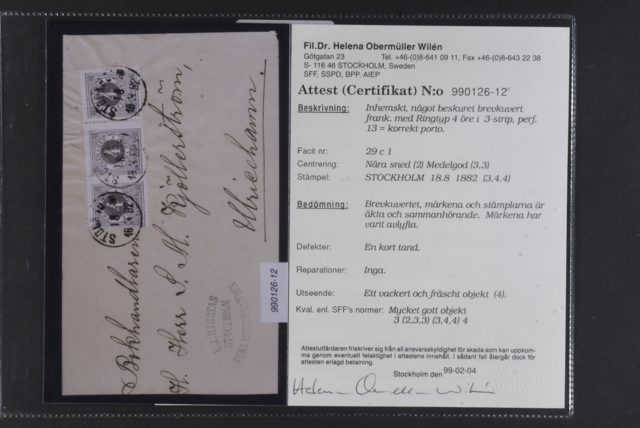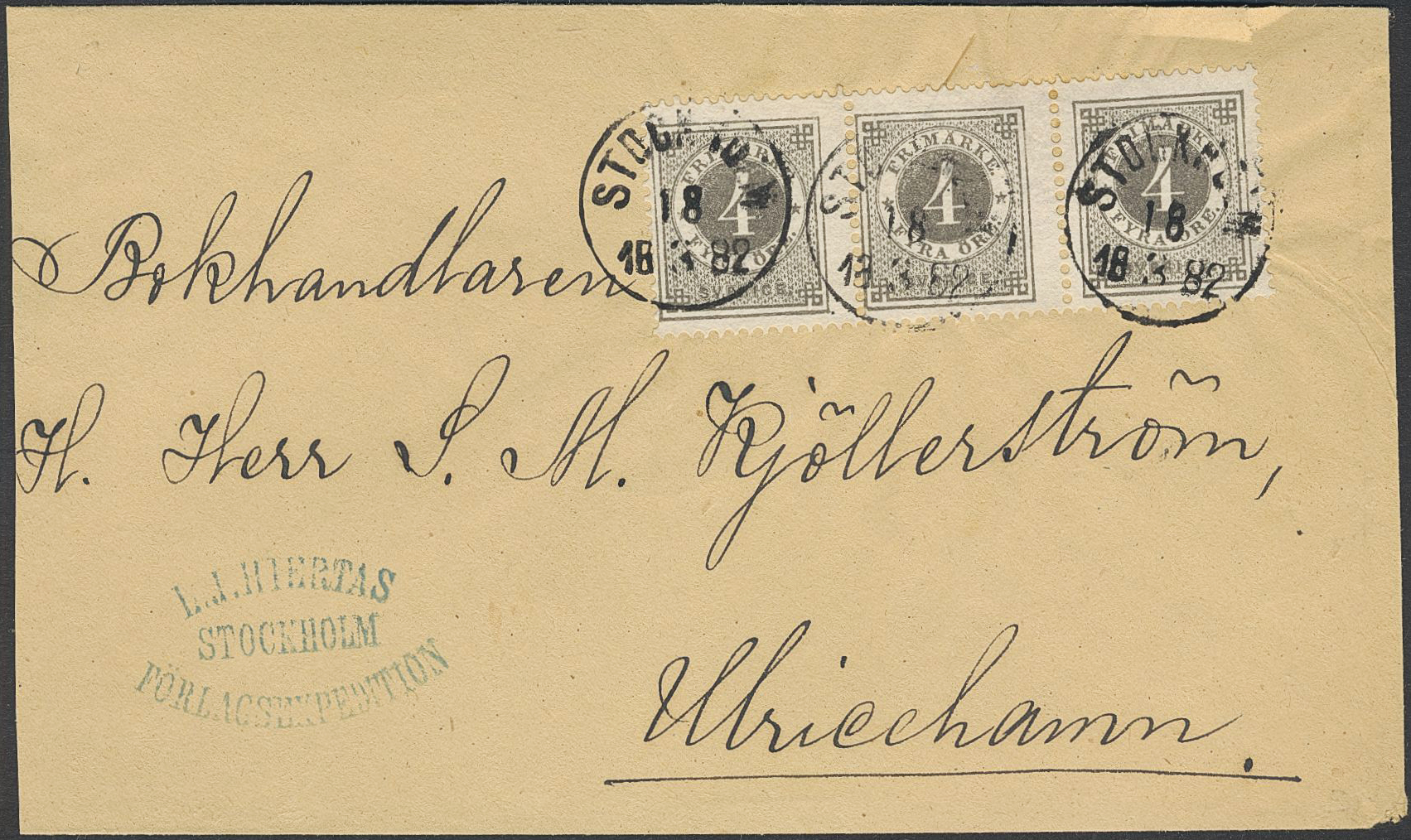 Sweden. Facit 29c1 on cover, 4 öre dark grey on white paper in strip of three. Cover sent from STOCKHOLM 18.8.1882 to Ulricehamn. Certificate HOW 3 (2,3,3) (3,4,4) 4 (1999).
