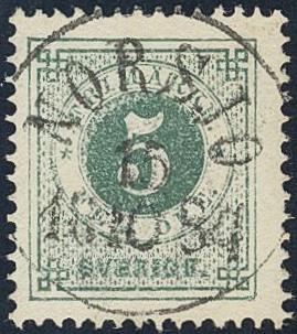 Sweden. Facit 30h used, 5 öre bluish dark-green on soft paper. EXCELLENT cancellation NORSJÖ 15.10.1884.