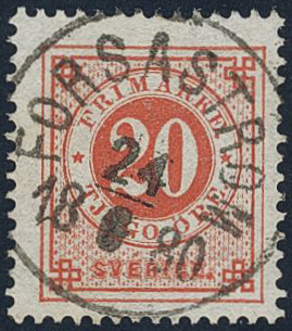 Sweden. Facit 33b used, 20 öre orange-red. Superb cancellation FORSATRÖM 24.6.1880.