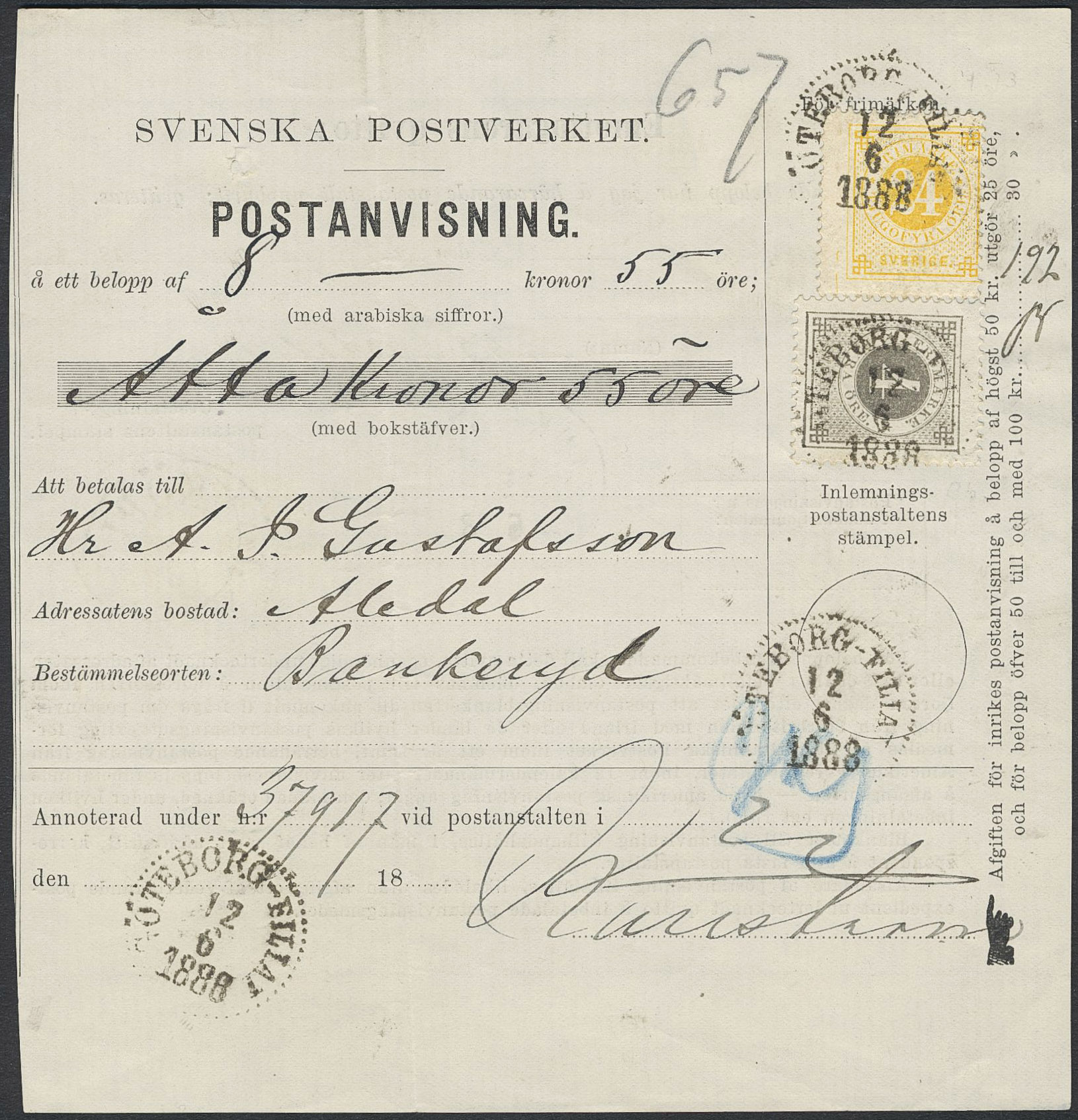 Sweden. Facit 34, 29 on cover, 4+24 öre on money order sent from GÖTEBORG-FILIAL 12.6.1888 to BACKERYD 15.6.1888.