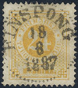 Sweden. Facit 34k used, 24 öre yellow on calendered paper. EXCELLENT cancellation FINSPONG 18.8.1887. Small owner mark on the reverse.