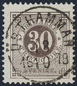 Sweden. Facit 35b1 v used, 30 öre black-brown with the paper slightly folded before printing. EXCELLENT cancellation ÖSTHAMMAR 18.10.1878. One somewhat short perf.