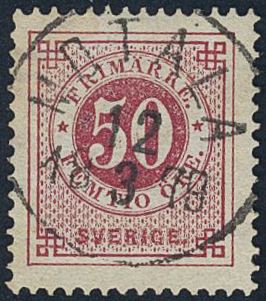 Sweden. Facit 36a used, 50 öre carmine. EXCELLENT cancellation MOTALA 12.3.1879.